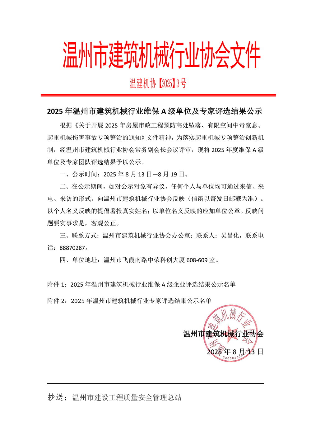 2025 年温州市建筑机械行业维保A级单位及专家评选结果公告